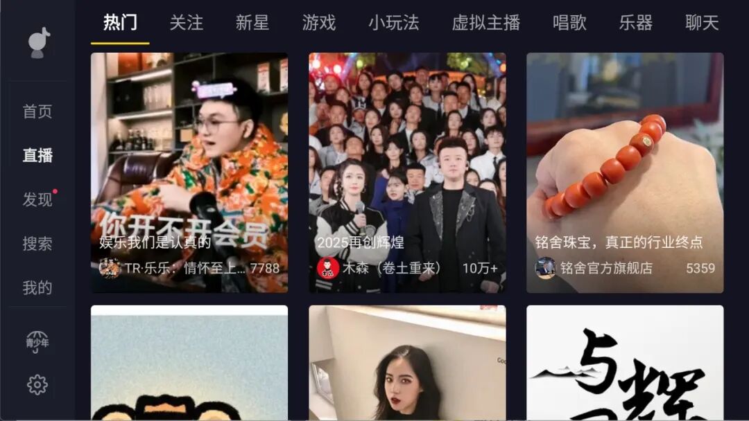 界面是专门为电视大屏设计的,删繁就简,操作一眼就懂。直播板块更是惊喜,分类细到绝:热门游戏激战、趣味互动玩法、虚拟偶像才艺秀,还有唱将舞台、乐器表演、聊天互动专区……各种精彩任你挑,总有一款合你口味。