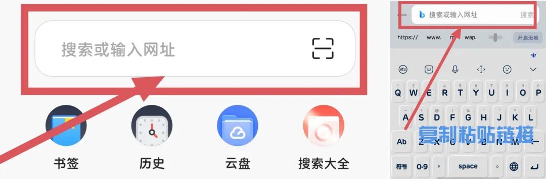 1.复制链接后,首先打开浏览器;其次打开搜索;然后点进搜索框粘贴链接